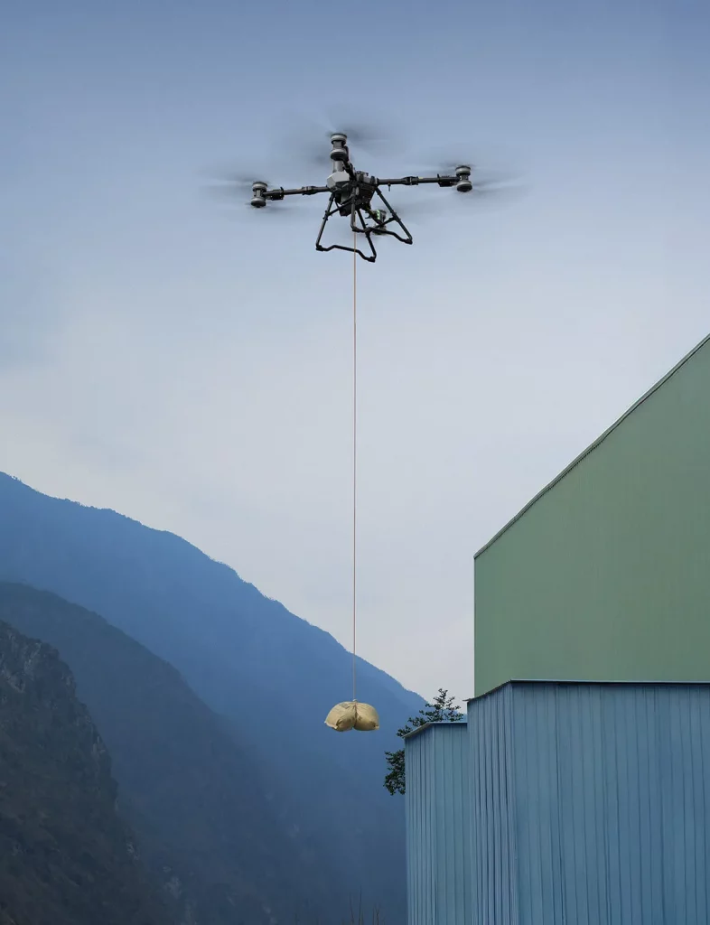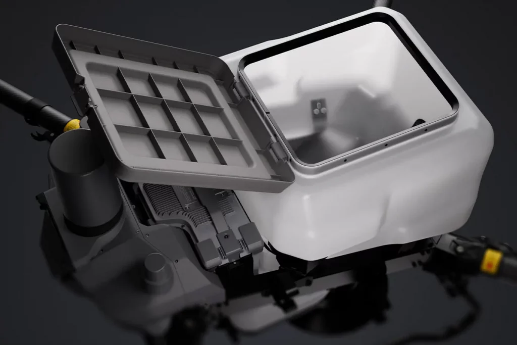 A estação de carregamento produz saída CA de 1.500 W, suficiente para alimentar o controle remoto, bomba d’água, recarregador, luzes e outros componentes. A bateria de voo inteligente de 30.000 mAh com seu dissipador de calor resfriado a ar padrão pode esfriar rapidamente.
